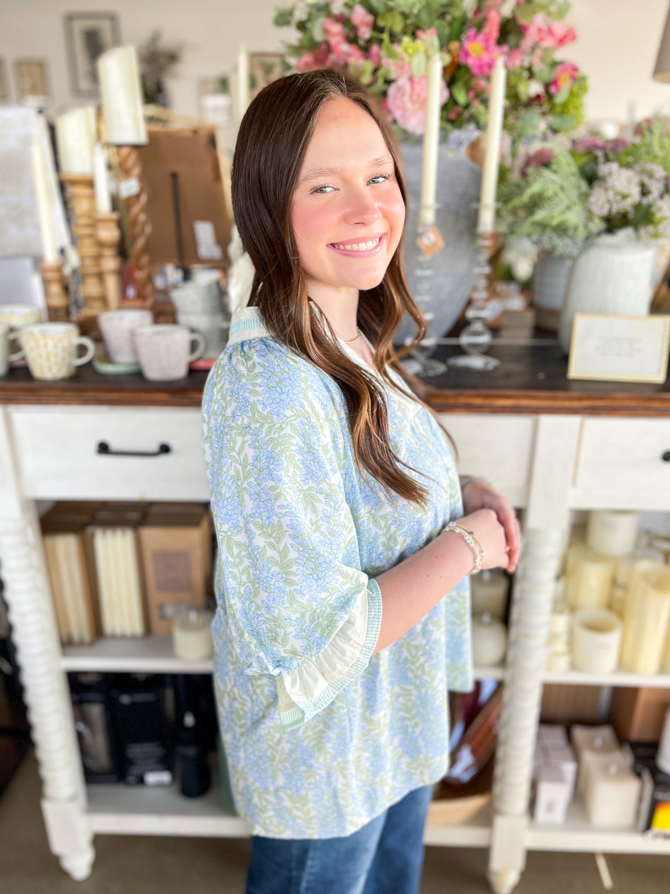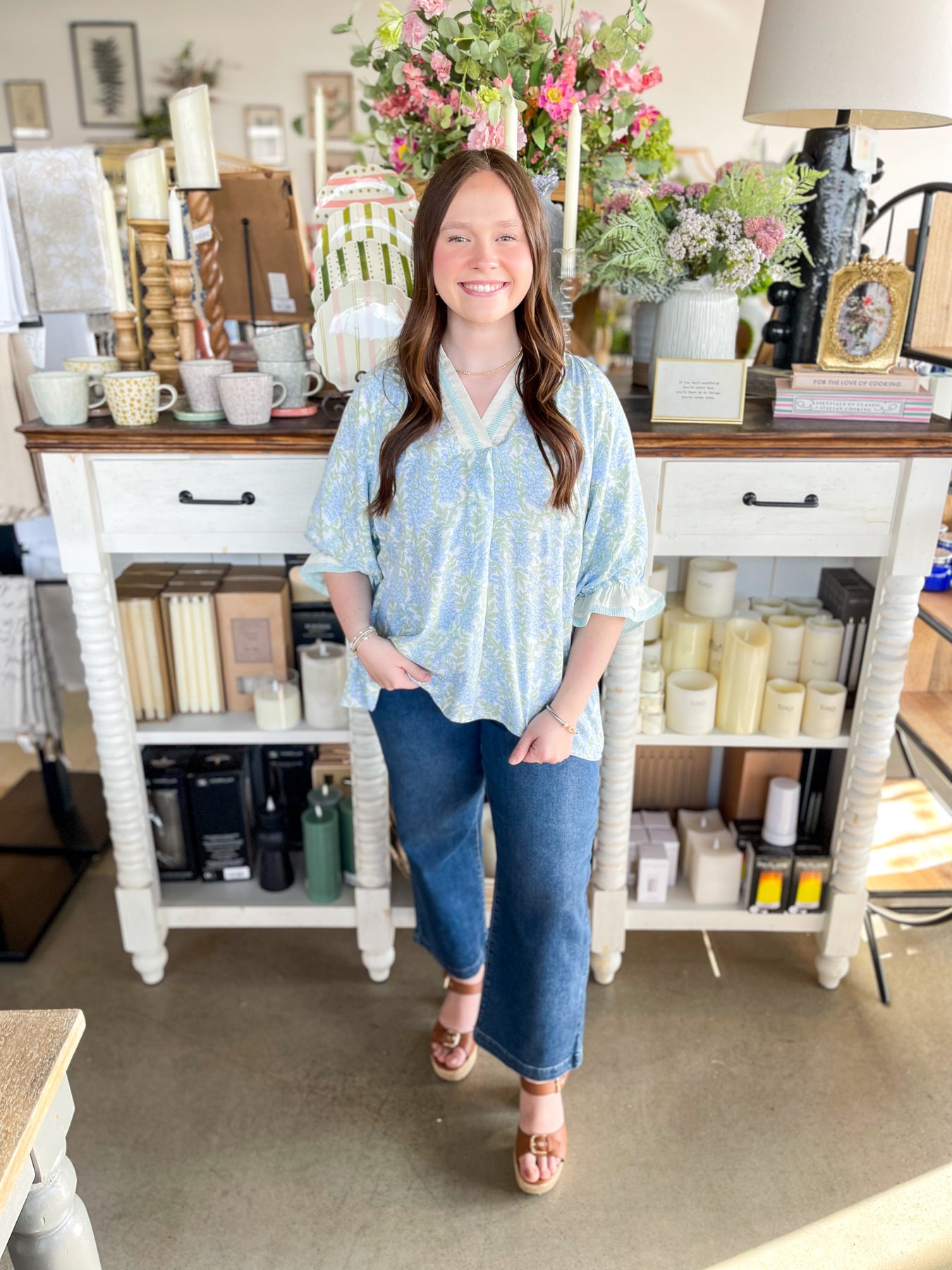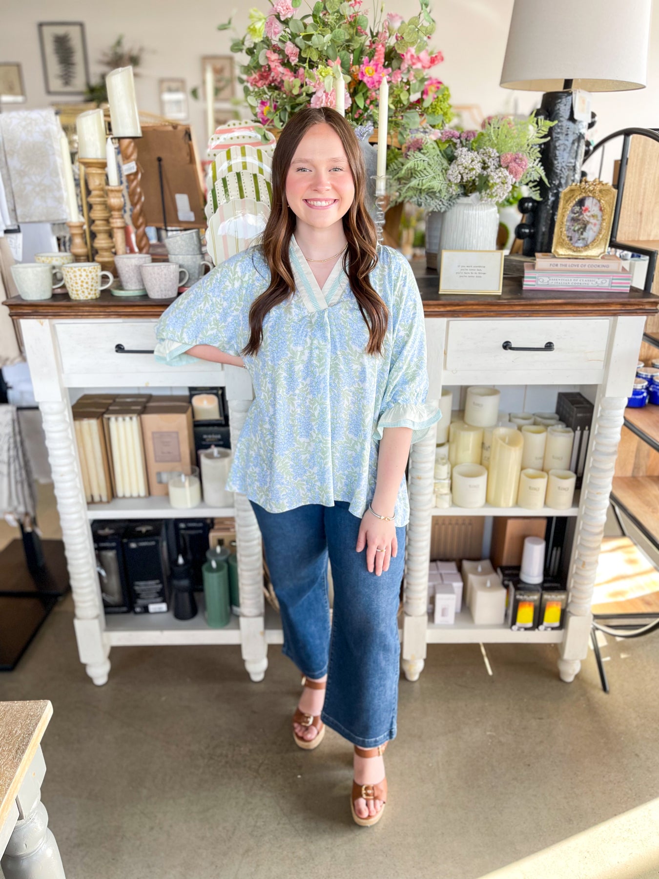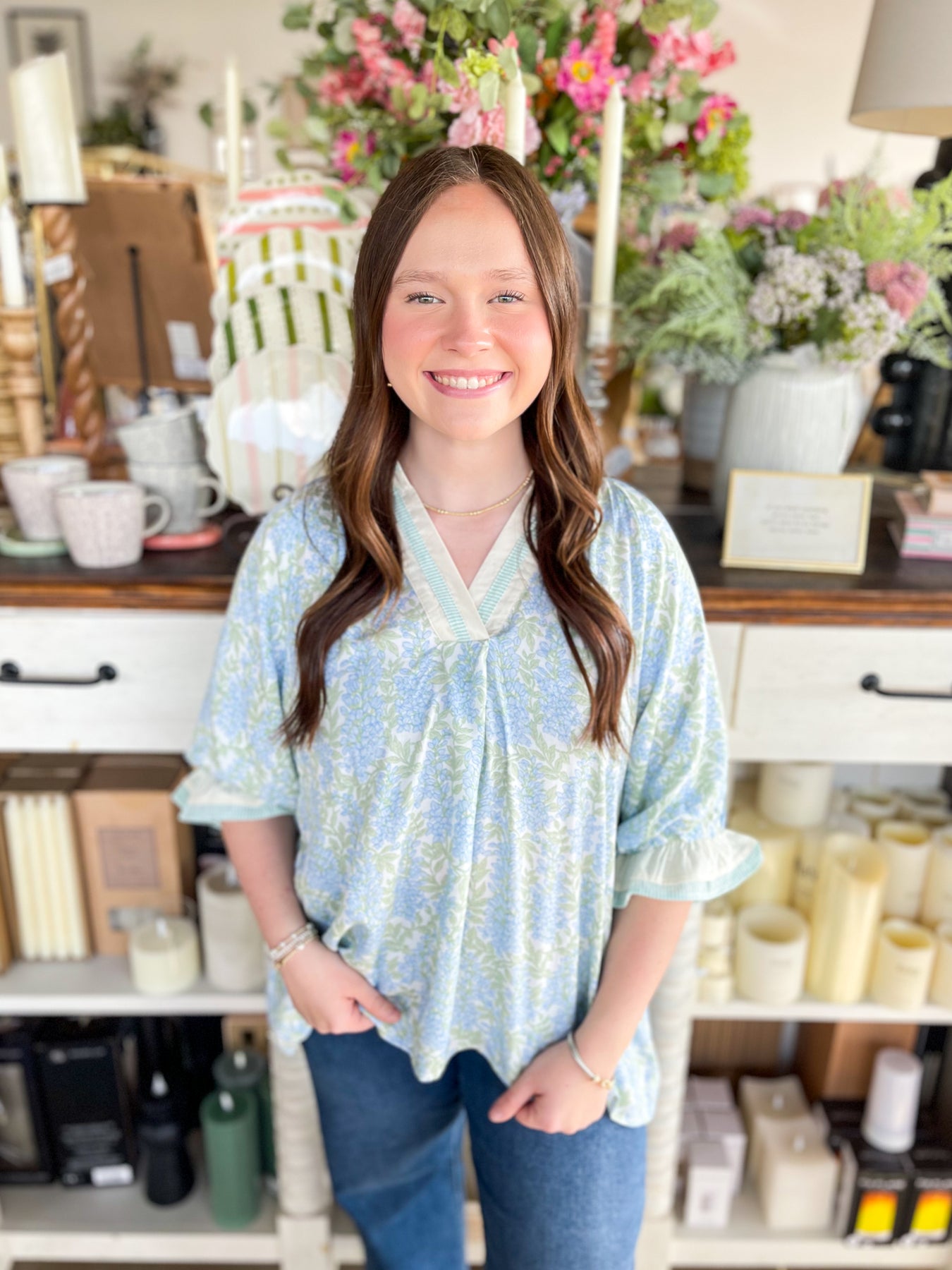 Fall head over heels for the Umgee Sky Mix Isla Top—your new spring essential! Super soft and wonderfully oversized, this lightweight beauty drapes just right for maximum comfort and style. The dainty blue and green floral print brings a fresh, trendy vibe that screams seasonal perfection. A charming varsity neckline pairs beautifully with three-quarter sleeves finished with elastic and ruffles for that extra touch of playful detail. Slip it on and feel the difference—this top is pure comfort wrapped in stunning style!