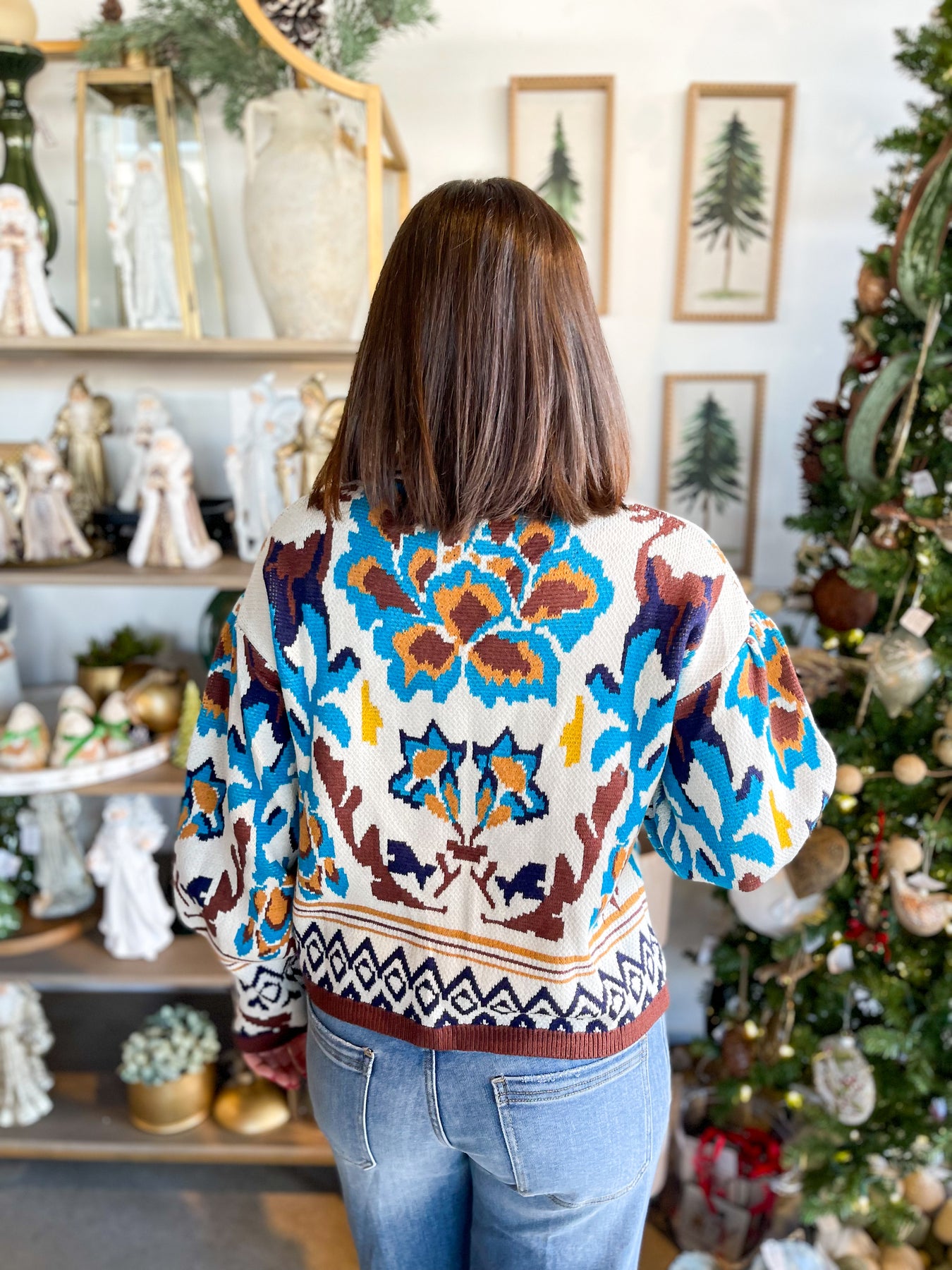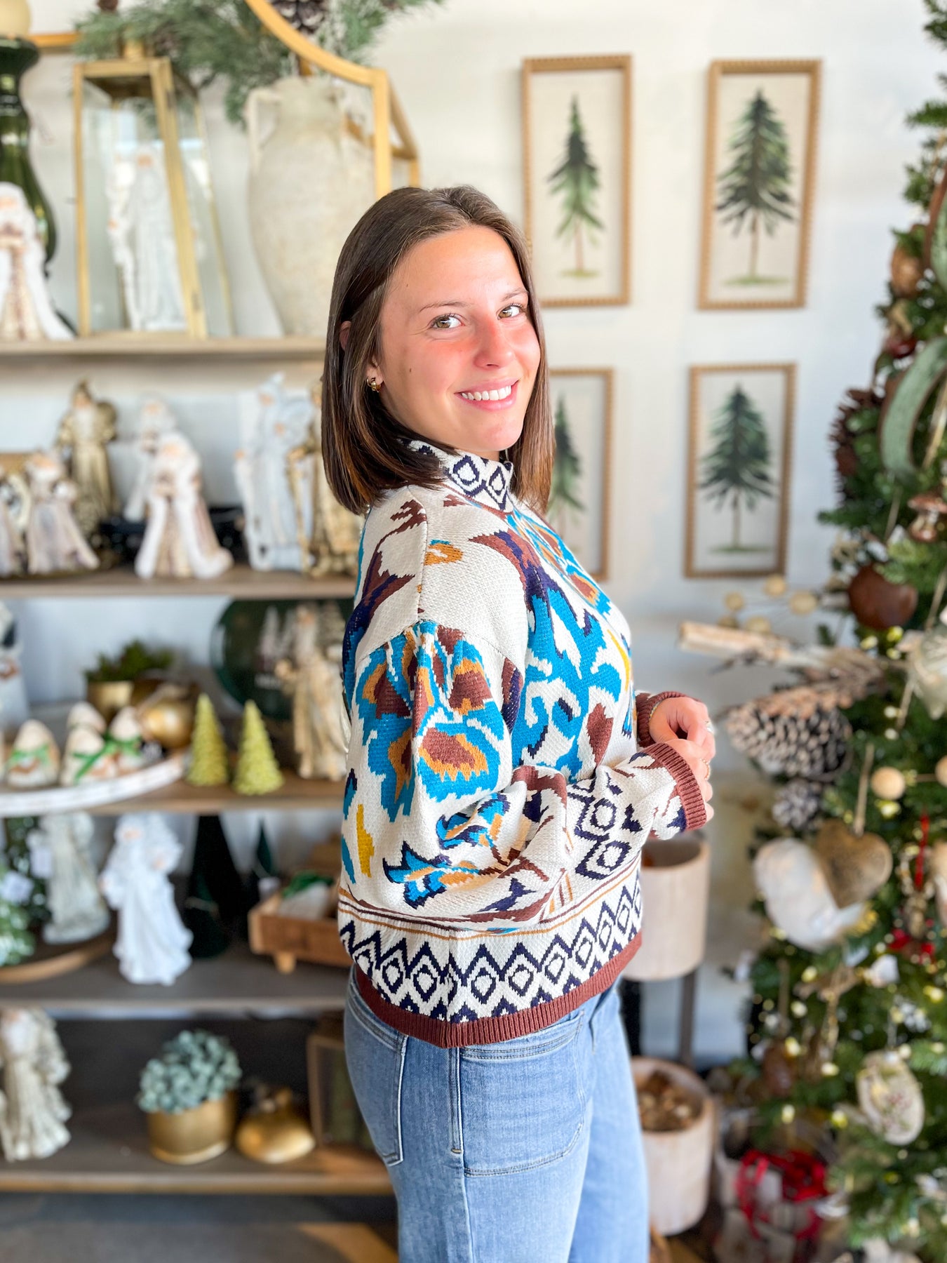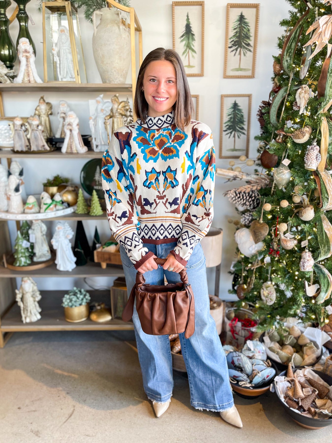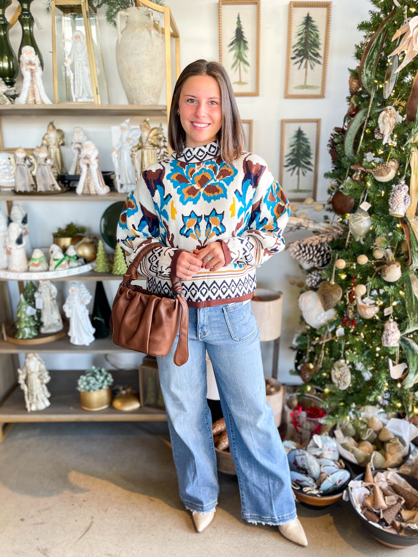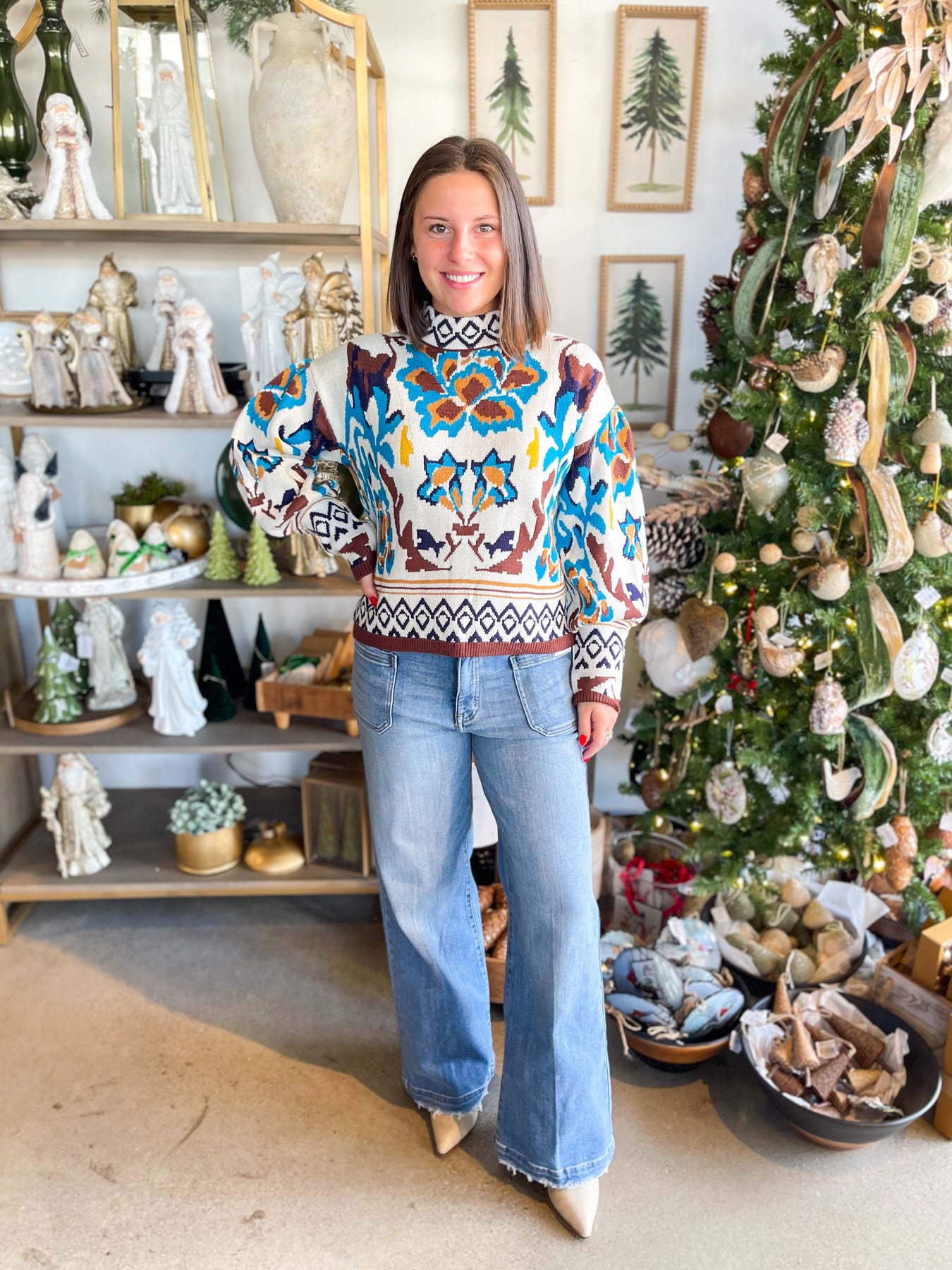 Introducing the Voy Multi Color Shannon Sweater - your new go-to for stunning style. The white, blue, and brown floral print adds a touch of uniqueness, while the fitted style and mock neck keep you on trend. The super soft fabric and warm, cozy design make this sweater both stylish and comfortable. Don't miss out!